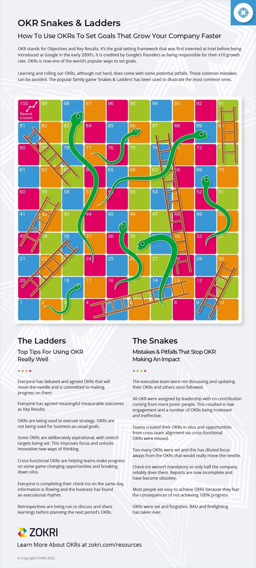 Some important nuances are outlined below and are illustrated in this OKR “Snakes and Ladders” infographic: