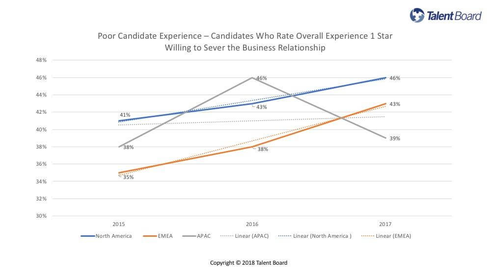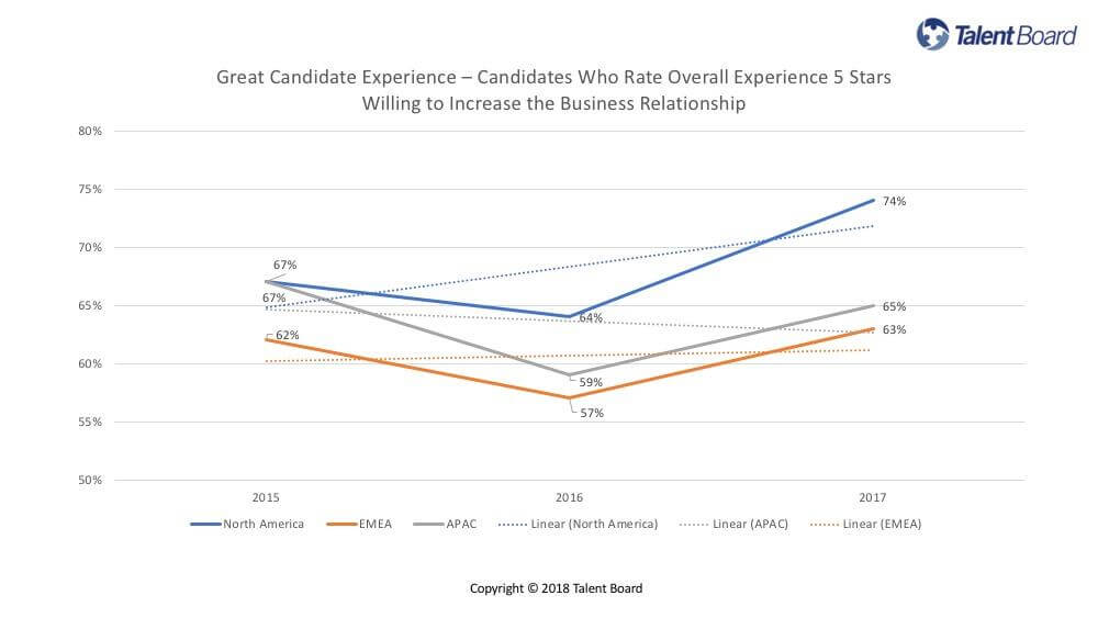 Here’s the good news for people obsessed with candidate experience (like me): Over the past three years, we’ve seen an overall incremental positive trend among very satisfied candidates. Candidates who give their experience 5/5 stars say they’ll increase their business relationship with the employer. That means they’re likely to apply again, refer others and buy stuff. That trend is true across all three global regions we survey.